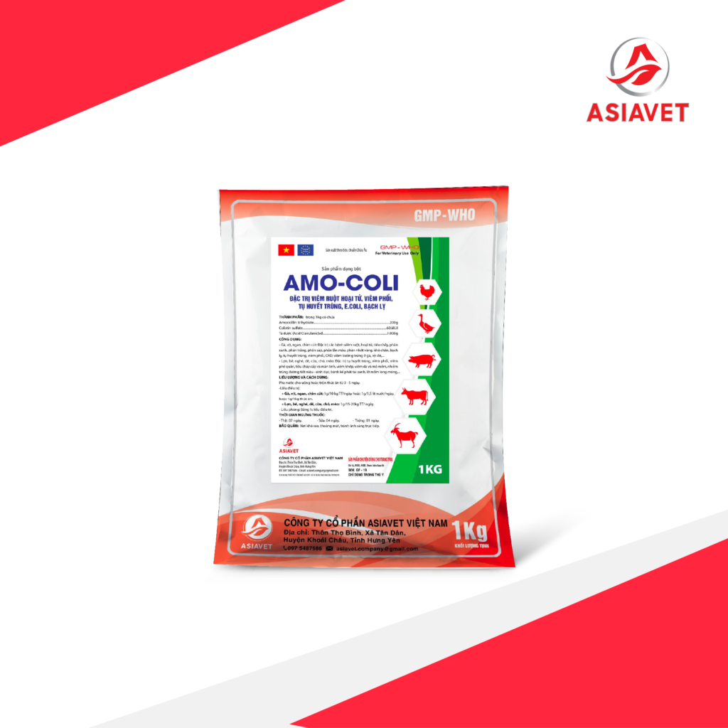 Bột AMO-COLI 1kg – Asiavet có tác dụng đặc trị viêm ruột hoại tử, viêm phổi, Tụ huyết trùng, E.coli, bạch lỵ, sưng mặt phù đầu.