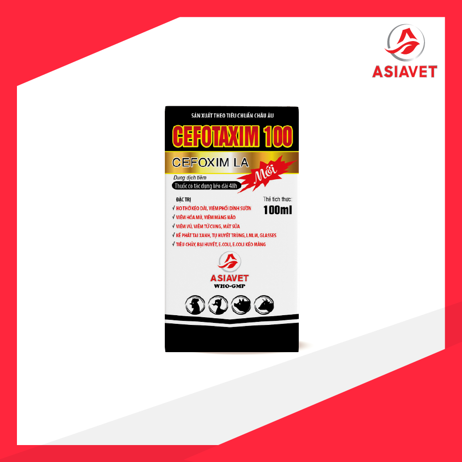 Dung dịch tiêm CEFOTAXIM 100 của Asiavet giúp đặc trị ho thở kéo dài, viêm phổi dính sườn, viêm hoá mủ, viêm màng não,viêm vú, viêm tử cung,…