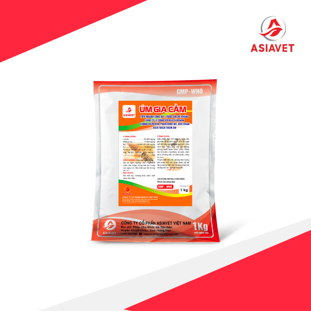 Úm gia cầm của Asiavet giúp tiêu nhanh lòng đỏ, tăng sức đề kháng, tăng tỷ lệ sống với gia cầm non. Sản phẩm giúp chống viêm rốn, phân dính đít, khô chân, kích thích thèm ăn.